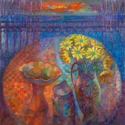 a strong oval, anchored by the horizontal and vertical compositional grid, provides underlying structure for richly chromatic shifts and contrasts of colour. The whole image is imbued with emotionally charged visual poetry.