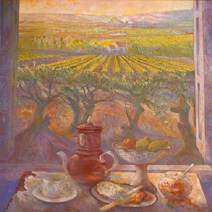 the experience of Provencial rural domesticity. A quasi geometrical compositional framework underpins the luscious colours of the still-life which are reflected in the subtly muted colours of the landscape.